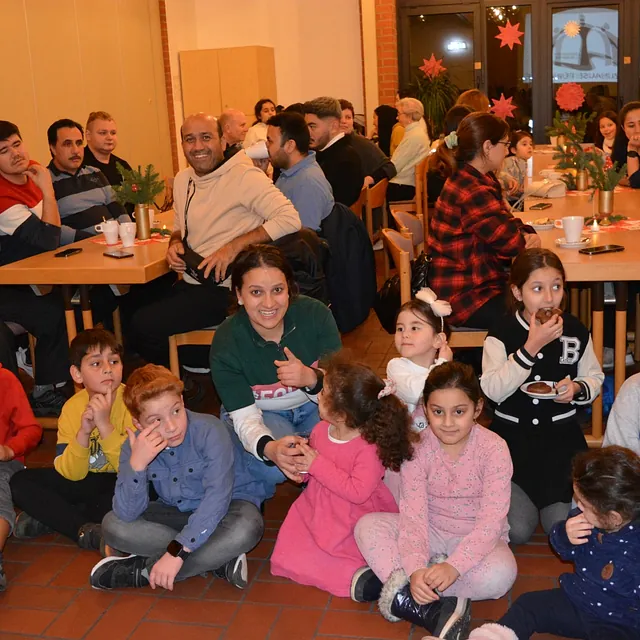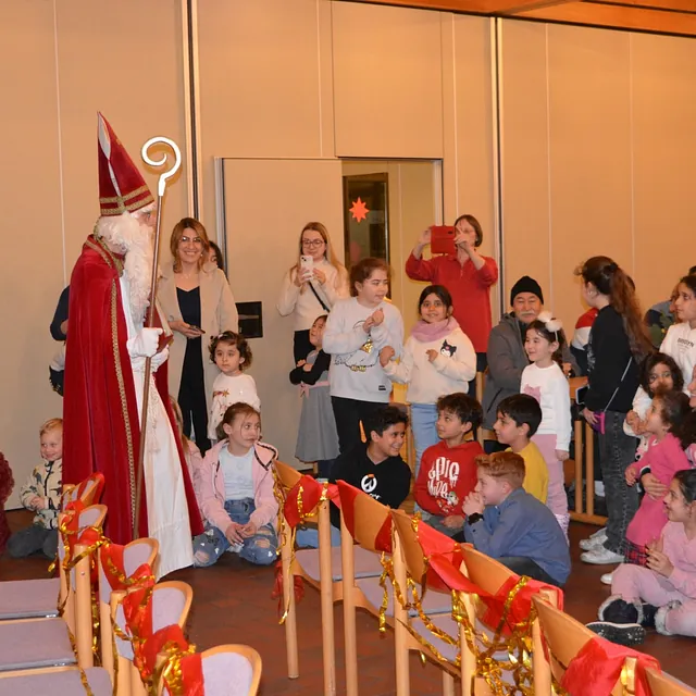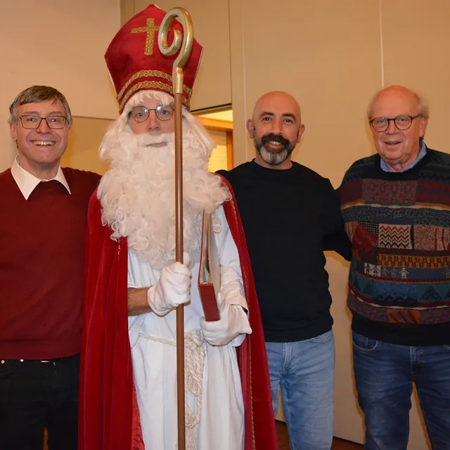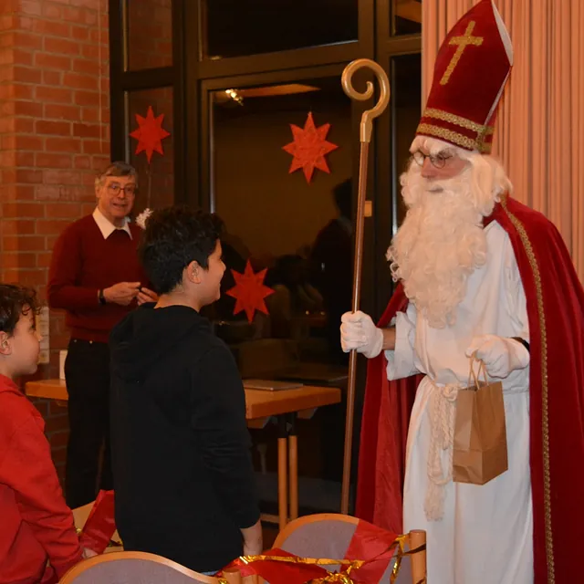 Stimmengewirr, freudige Anspannung, erwartungsfrohes Geplauder, Neugier: „Wann kommt er – der Nikolaus - ins Begegnungscafé?“ Die Wartezeit im Gemeindesaal, der Mitte Dezember mit zahlreichen Besuchern aus verschiedenen Ländern gut besetzt war, wurde bei Kaffee /Tee mit weihnachtlichem Gebäck und im Spielzimmer überbrückt. Natürlich sollte der Nikolaus musikalisch begrüßt werden. Mit der Gitarrenbegleitung von Pfarrer Michael Gallach war das kein Problem. Kleine und große Sänger sorgten für die adventliche Einstimmung. Dann – endlich – war es soweit! Andreas Bodenbenner, erstmals in seiner Eigenschaft als Nikolaus, wurde freudig begrüßt. Erwartungsvoll lauschten die Besucher seinen Erzählungen: Die Geschichte über den heiligen Nikolaus von Myra, sein Leben und Wirken sowie eine Legende. Der Nikolaus begegnete den Kindern auf Augenhöhe und wusste, sie auf liebenswerte Art und Weise in diese besondere Adventsfeier einzubeziehen.