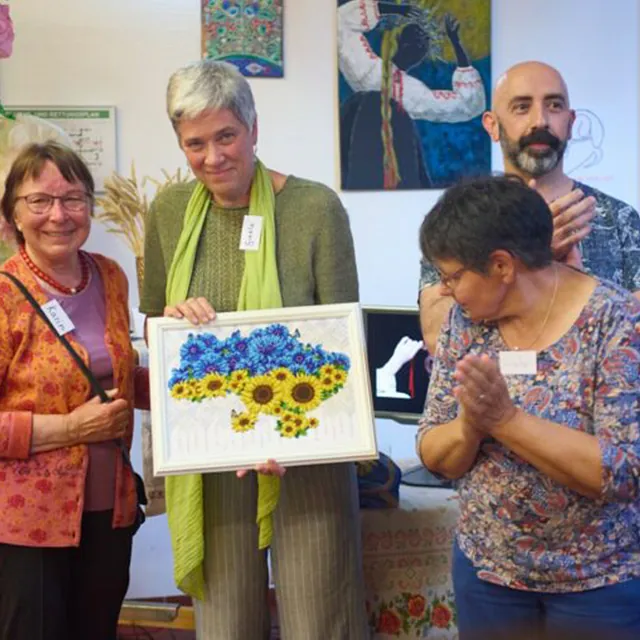 Das Team des Begegnungscafés wurde mit einem besonderen Geschenk der ukrainischen Organisatorinnen überrascht: ein Perlenbild in den Landesfarben Gelb und Blau – Sonnenblumen und Kornblumen.