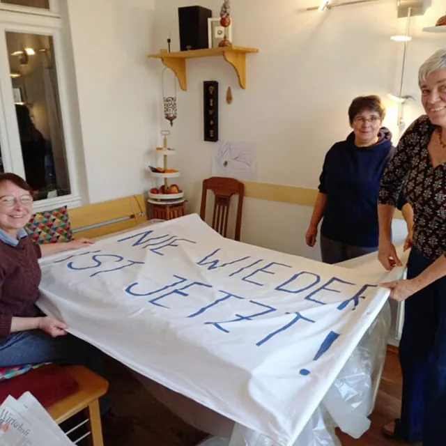 Am Tag des Gedenkens der Opfer des Nationalsozialismus beteiligten wir uns mit einem Banner „Nie wieder ist jetzt“ am Aktionsbündnis gegen Extremismus und gesellschaftliche Spaltung.